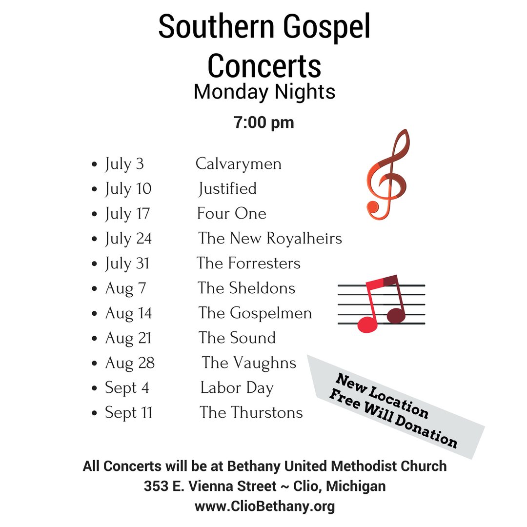 The Monday Gospel Concerts begin tonight at 7pm here at Clio Bethany UMC with The Thurstons starting us off this wonderful time of year.