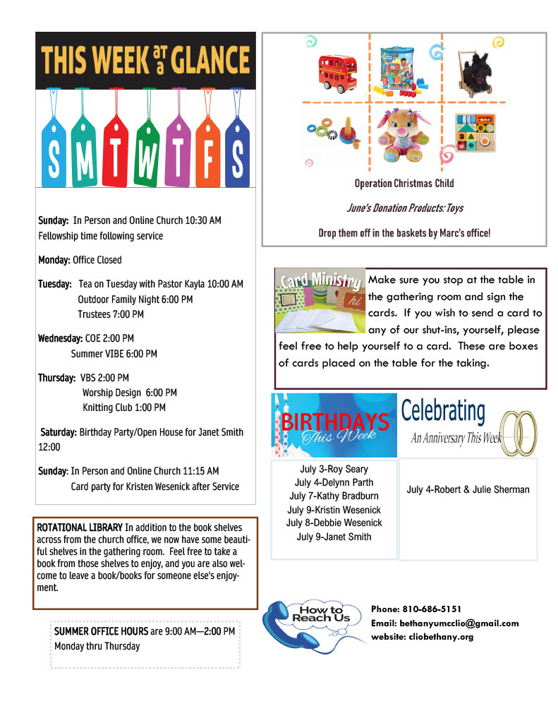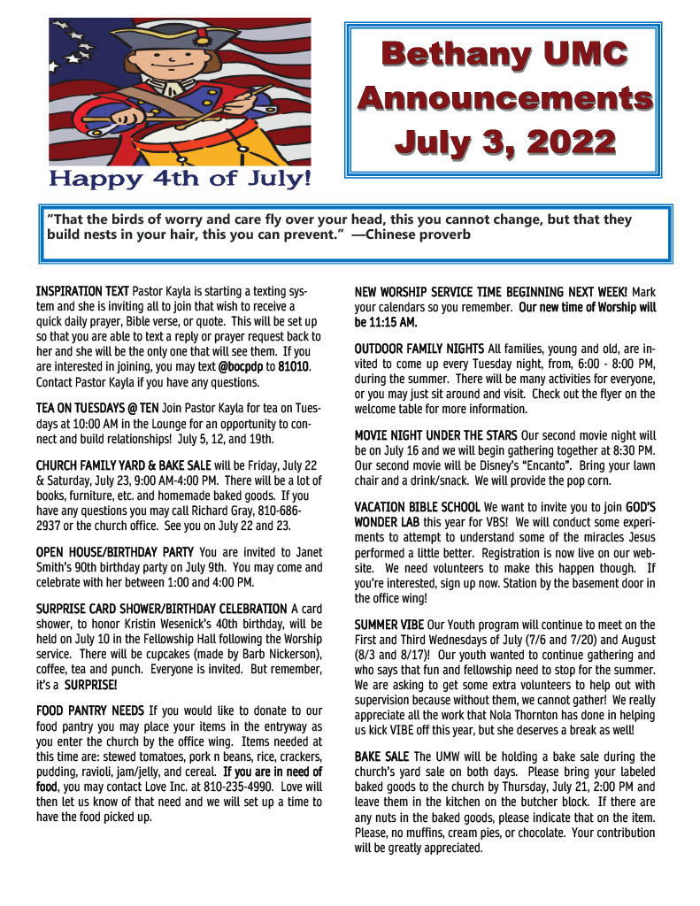 On Sunday July 3, 2022, we held worship at our NEW time: 11:15am. We also were joined for the first time by Rev. Kayla Roosa, our new pastor. Pastor Kayla led the pastoral prayer and served Holy Communion. Elizabeth Whiting who is usually behind the scenes in the sound booth delivered our message as she reflected on what she has learned from observing intently the birds. If you missed worship, catch up by watching below: