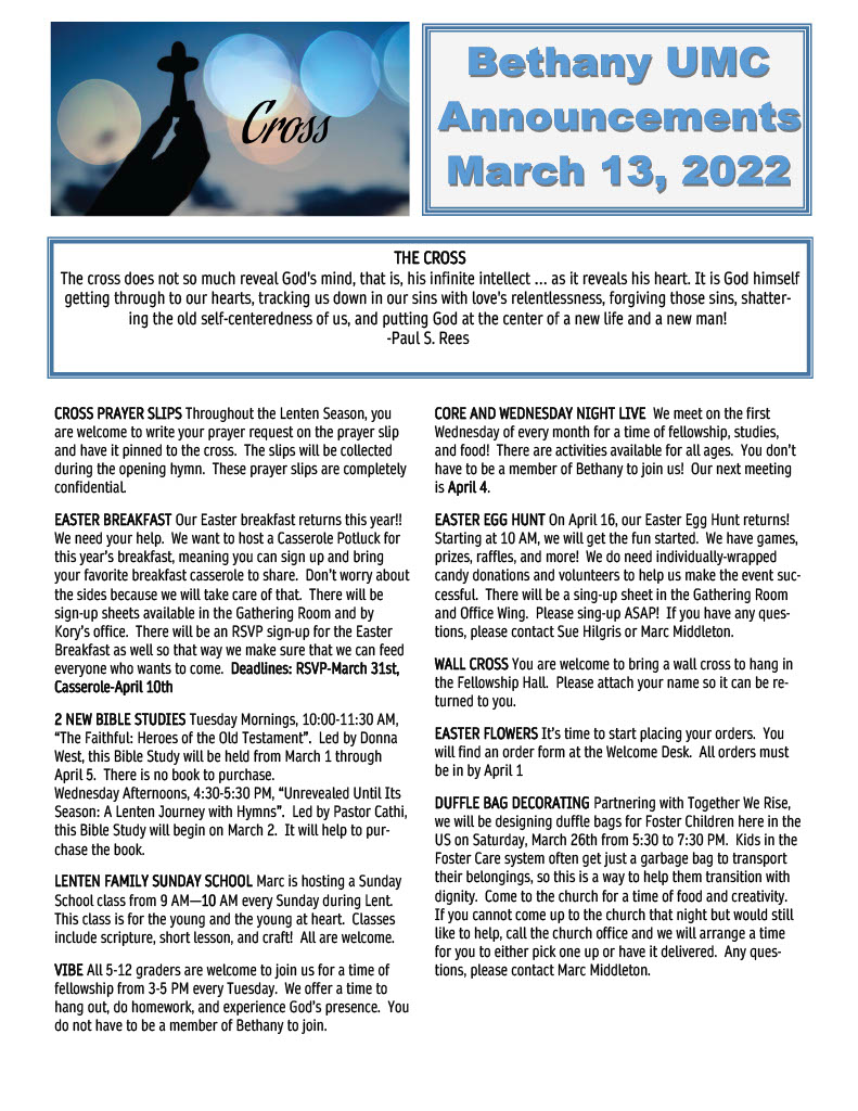 Did you miss worship on Sunday 3.13.2022? If so, you missed some powerful preaching and teaching in our ongoing series, Lent In Plain Sight. You also missed the announcement of our pastoral appointment beginning July 1, 2022. Plan to spend some time with us as in the months to come as we prepare for Pastor Cathi’s retirement celebration. Check out our weekly announcements and link to worship below.