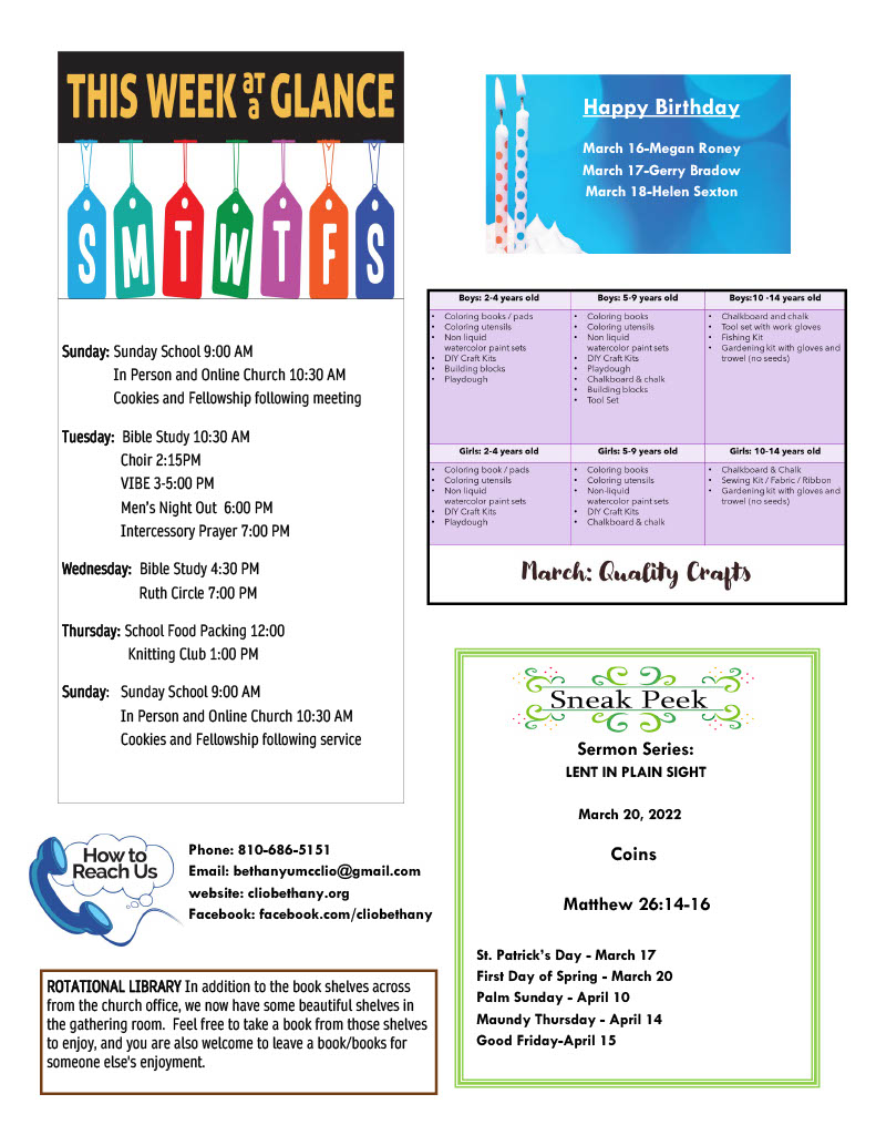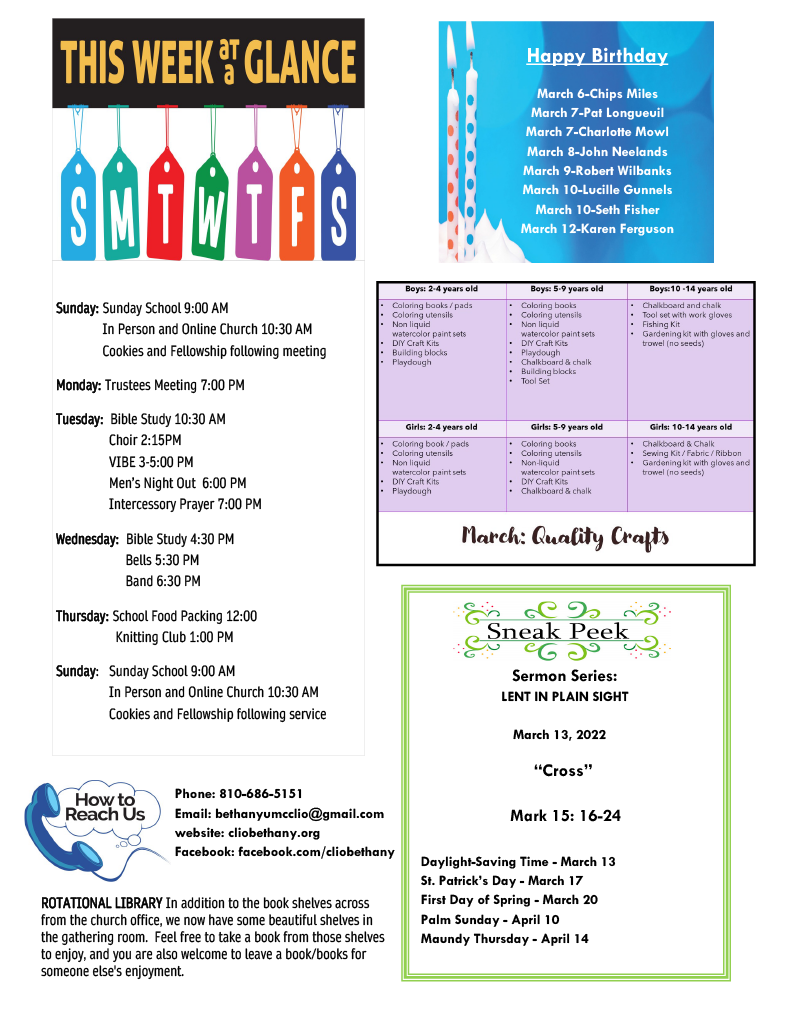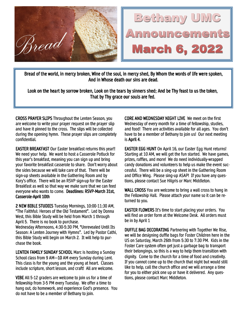 For the Lenten Season, we are offering an all-age Sunday School class from 9am to 10am starting Sunday, March 6th and continuing every Sunday until April 10th. Following alongside our Lenten Series, we will offer a small devotional, snack and craft that goes along with our worship service. We will meet in Classrooms 3 and 4 (next to Marc’s office) for a fun time of learning what Lent means and with objects we interact with every day. We are encouraging everyone who plans on attending to wear a mask. If you have any questions, please contact Marc Middleton