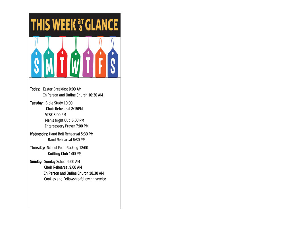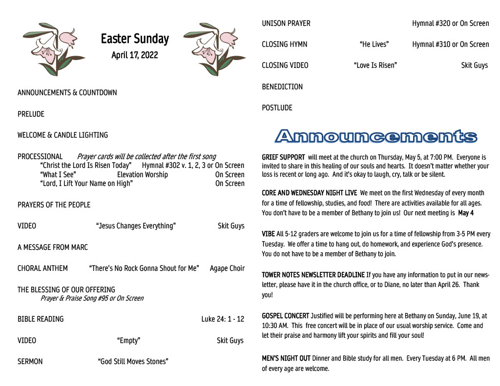 Here’s our bulletin and announcement from Easter Sunday. If you were unable to join us, the entire worship service is embedded and viewable below.
